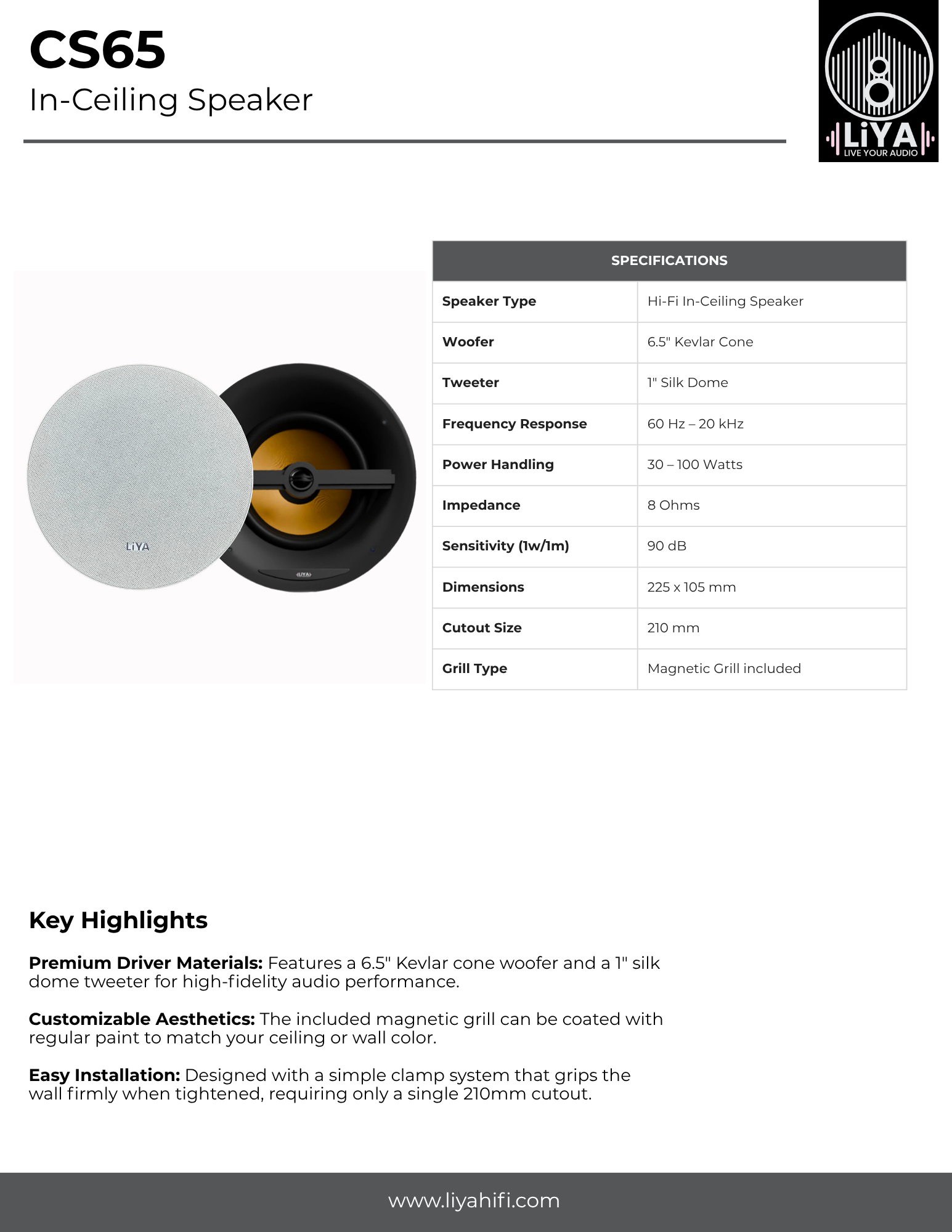 Elevate your home or commercial audio experience with the CS65 Kevlar In-Ceiling Speaker. Engineered for those who refuse to compromise on sound quality or aesthetics, the CS65 combines professional-grade materials with a discrete architectural design to deliver a true Hi-Fi experience.