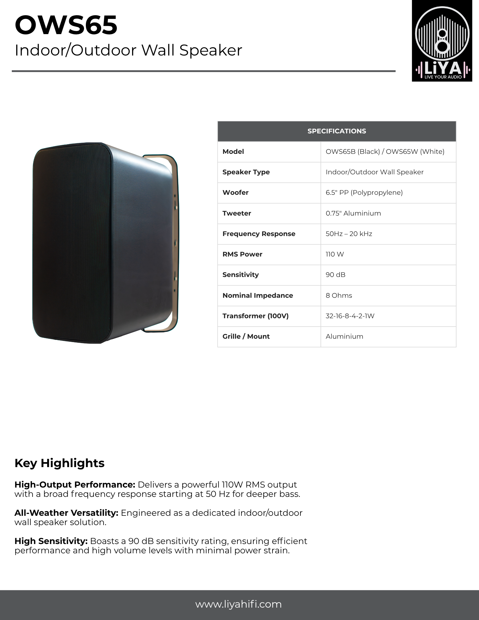 The OWS65 is Indoor/Outdoor Wall Speaker a professional-grade audio solution engineered to deliver high-fidelity sound across both sophisticated interiors and demanding exterior environments. As a flagship model in the LiYA range, the OWS65 features a high-performance 6.5″ Polypropylene woofer and a 0.75″ Aluminium tweeter, providing a powerful 110W RMS output with crystal-clear precision from 50Hz to 20kHz.